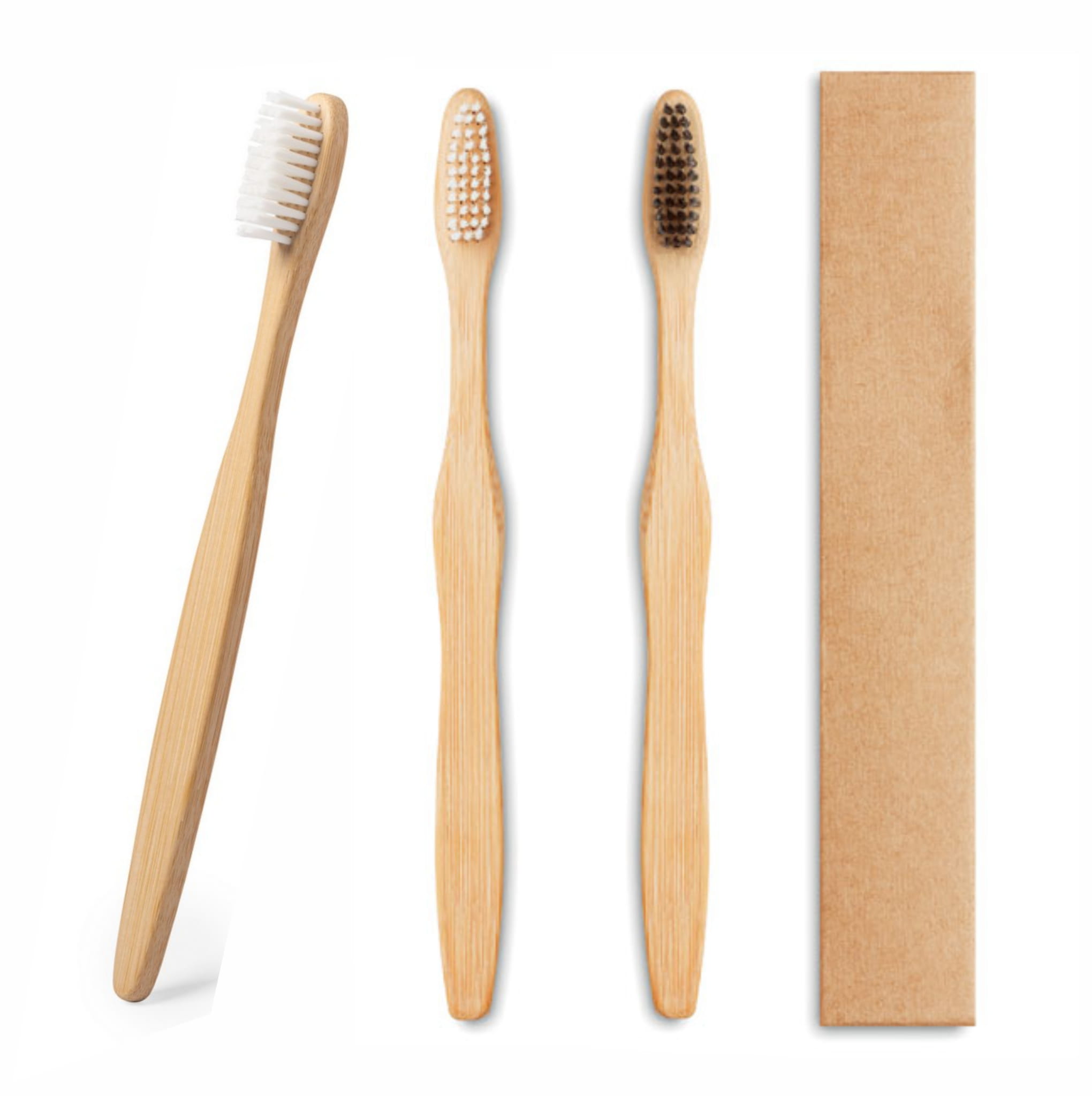 Bambusowa szczoteczka do zębów, włosie z nylonu. Zapakowana w pudełko z papieru kraft.