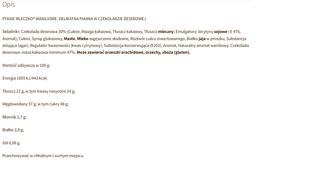 Składniki: Czekolada mleczna 31 % (Cukier, Tłuszcz kakaowy, Mleko pełne w proszku, Miazga kakaowa, Serwatka w proszku (z mleka), Tłuszcz mleczny, Emulgatory: lecytyny sojowe i E 476, Aromat), Cukier, Syrop glukozowy, Masło, Mleko zagęszczone słodzone, Roztwór cukru inwertowanego, Białko jaja w proszku, Substancja żelująca (agar), Regulator kwasowości (kwas cytrynowy), Śmietanka w proszku, Aromaty, Substancja konserwująca (E 202), Barwnik (karmel amoniakalno – siarczynowy). Czekolada mleczna: masa kakaowa minimum 32 %, masa mleczna minimum 18 %. Może zawierać orzeszki arachidowe, orzechy, zboża (gluten).